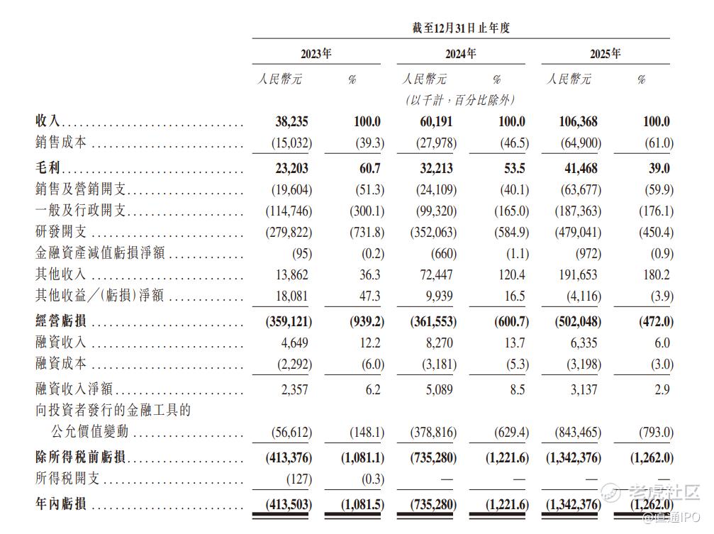 报告期内,曦智科技收入分别约3823.5万、6019.1万、1.06亿元,复合年增长率为66.9%;毛利分别为2320.3万、3221.3万、4146.8万元,毛利率分别为60.7%、53.5%、39.0%;年内亏损分别约4.14亿、7.35亿、13.42亿元;研发开支分别约2.80亿、3.52亿、4.79亿元。