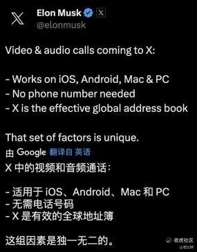 2023年8月,马斯克在X平台上官宣,X平台即将上线“音频与视频通话”的功能,无需电话号码即可呼叫对方,适用于iOS、Android、Mac和PC设备。