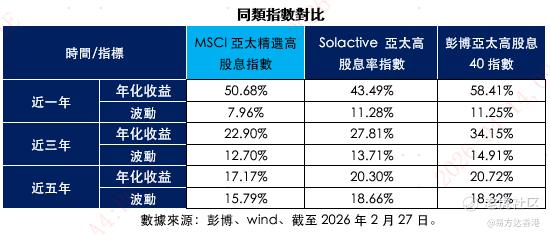 正因为如此,MSCI亚太精选高股息指数的风险收益效率明显领先于同类指数。近一年,该指数波动率仅为7.96%,显著低于香港市场上的其他亚太高股息指数。把时间拉长至3年和5年维度,指数波动率亦整体更低,体现出更优的风险收益特征。
