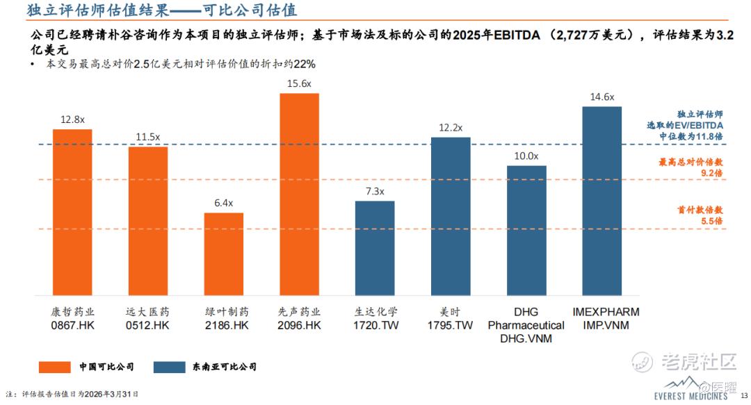 除了资金安排外,这次交易的估值也十分合理:海森新加坡的估值明显低于同行业可比公司。经第三方咨询公司评估,基于市场法及标的公司2025年EBITDA测算,海森新加坡的合理估值约为3.2亿美元,而云顶新耀最终仅以2.5亿美元收购,相对于评估价折价约22%。