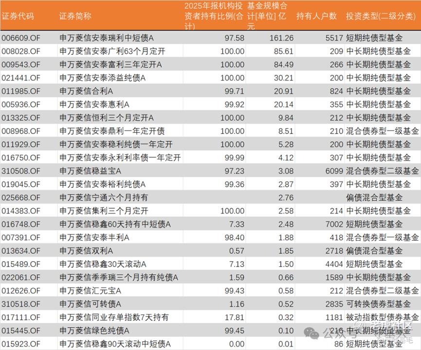 更值得警惕的是,申万菱信基金旗下规模较大的债基,几乎都存在机构占比极高、持有人户数极低的问题。这种“单一机构+极少数散户”的结构,本质上是一只依靠“帮忙资金”维持存续的产品,几乎未能获得真正的公众投资者认可。