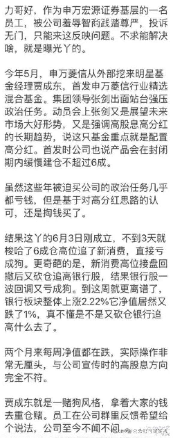截图中提到:员工吐槽被迫买的由贾成东管理的申万菱信行业精选,宣传时承诺封闭期缓慢建仓、不超6成、重点配置高分红。结果6月3日刚成立,不到3天直接梭哈6成仓,高位追新消费,新消费崩了,砍仓追高银行,又撞上银行大跌。更离谱的是,银行板块大涨2.22%那周,这只基金反而跌1%,明摆着又砍仓去追别的热点。