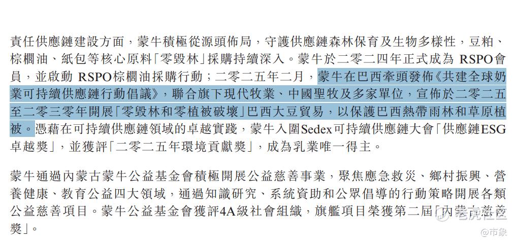 2025年,蒙牛发布《共建全球奶业可持续供应链行动倡议》,带动超千家供应商绿色转型。一个标志性动作:联合现代牧业、中国圣牧等宣布,2025-2030年开展“零毁林和零植被破坏”巴西大豆贸易,直接保护热带雨林。