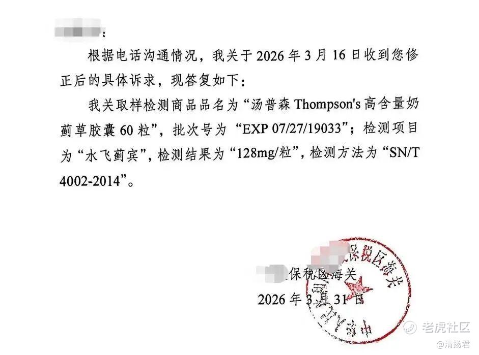 事实上,早在媒体曝光之前,官方抽检就已发现问题。3月31日,某保税区海关在接到消费者投诉后对汤普森产品进行了抽检,书面回复结果显示,其每粒水飞蓟宾含量仅有128毫克,进一步证实了成分虚标的情况。