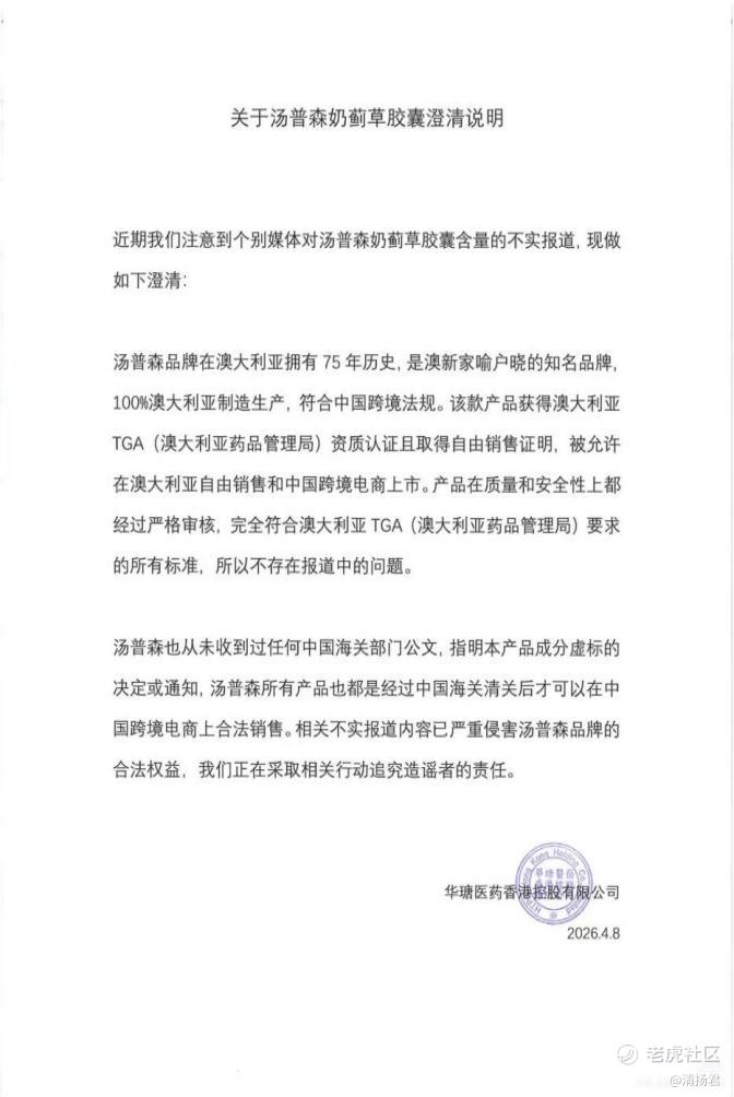 不过,汤普森官方账号于4月8日和10日两次发布声明,指出相关报道不实,强调其产品成分含量符合澳大利亚药品管理局的审核与注册要求,并表示将追究造谣者的责任。声明中还称,自身产品合规,且从未收到过任何中国海关关于成分虚标的通知。