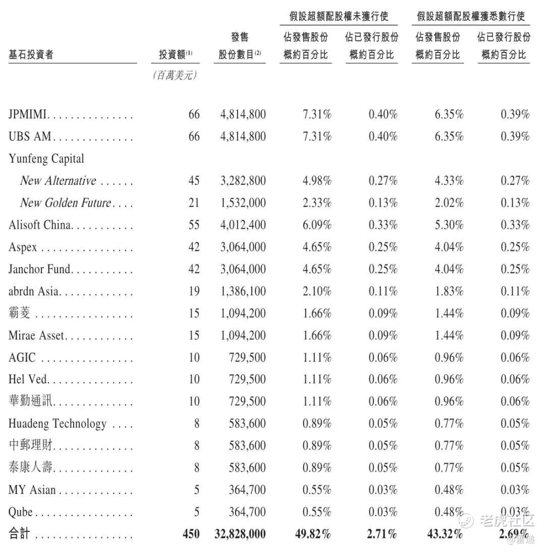 阿里旗下Alisoft China认购5500万美元,Li Ho Kei通过Aspex、Janchor Fund分别认购4200万美元,abrdn Asia认购1900万美元,霸菱、Mirae Asset分别认购1500万美元,AGIC、柴允敏旗下Hel Ved、华勤通讯分别认购1000万美元,Huadeng Technology、中邮理财、泰康人寿分别认购800万美元,MY Asian、Qube分别认购500万美元。