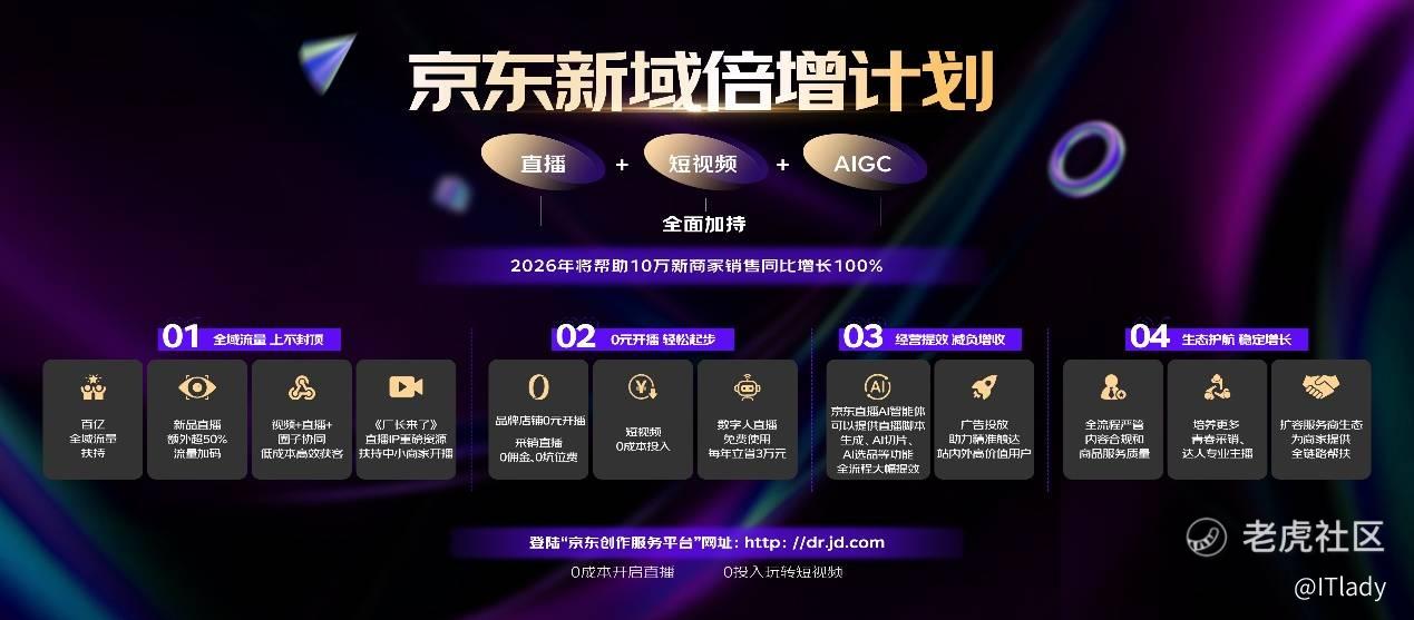 为进一步降低商家入局直播和短视频的门槛、提升流量转化和经营效率,京东在2026年围绕流量扶持、降本增收、智能提效、生态护航四大维度,推出12项关键举措,全方位助力商家实现确定性增长。