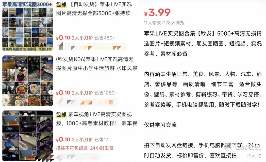 目前实况照片的售价普遍在3到30元一组,50张起步,日常照最便宜,头等舱、高尔夫、邮轮等场景的价格稍高。
