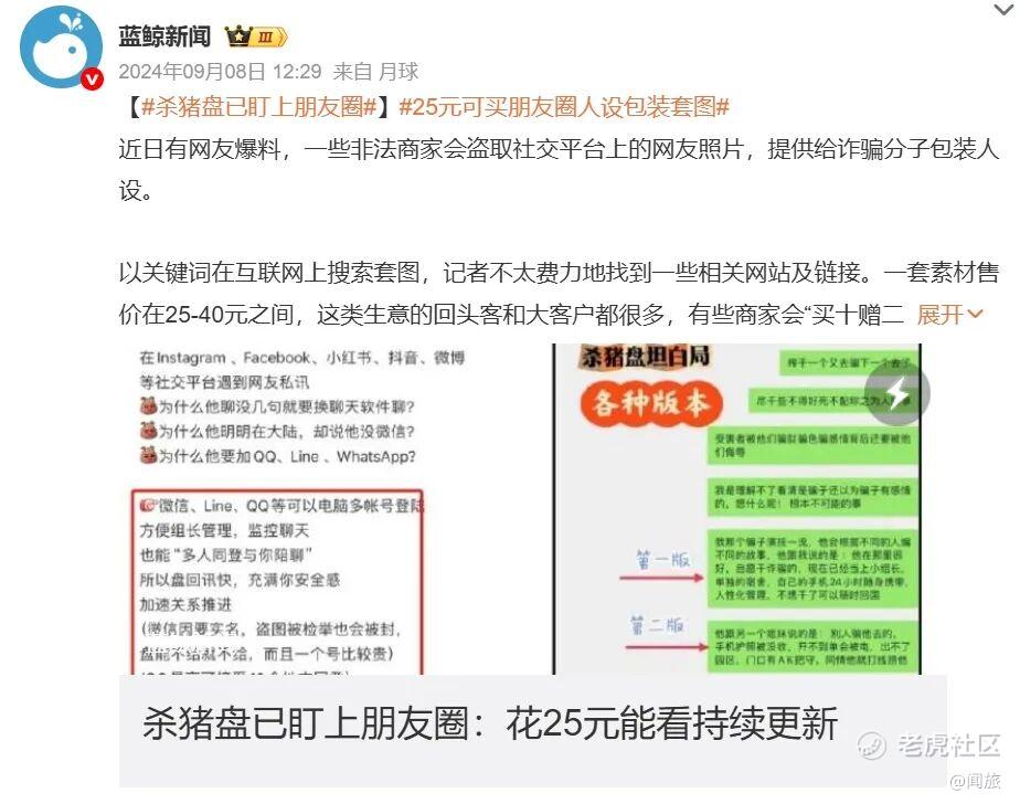 有人用买来的朋友圈素材,在婚恋网站上把自己包装成“高富帅”或“白富美”,获取感情和金钱后消失。这就是典型的“杀猪盘”套路,那些精致照片,就是用来养猪的饲料。