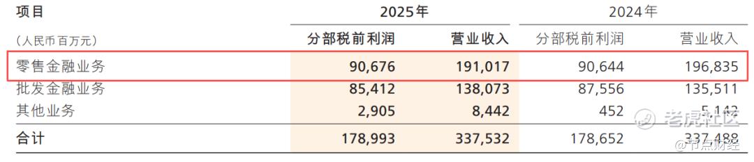 财报显示,2025年,招商银行零售业务实现营收1910.17亿元,较2024年同期的1968.35亿元减少58.18亿元,降幅2.96%;实现税前利润906.76亿元,较2024年同期的906.44亿元,微增0.32亿元,增幅0.04%。