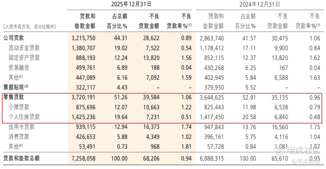 更令人关注的是风险。2025年,招商银行零售贷款的不良率由0.96%抬升至1.06%,上浮了10个基点。其中,曾经的优质资产小微贷款不良率从0.79%跳涨至1.22%;个人住房贷款不良率也从0.48%微升至0.51%。