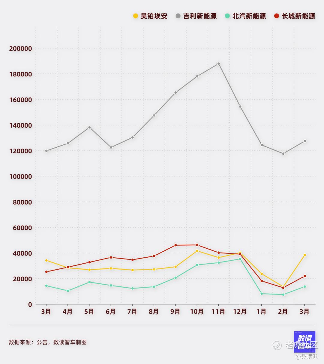 一季度的传统淡季,厂商指标完成进度往往比较慢。目前,吉利及旗下新能源品牌进度较为积极,极氪完成了26%,银河完成了24%,领克完成了20%。