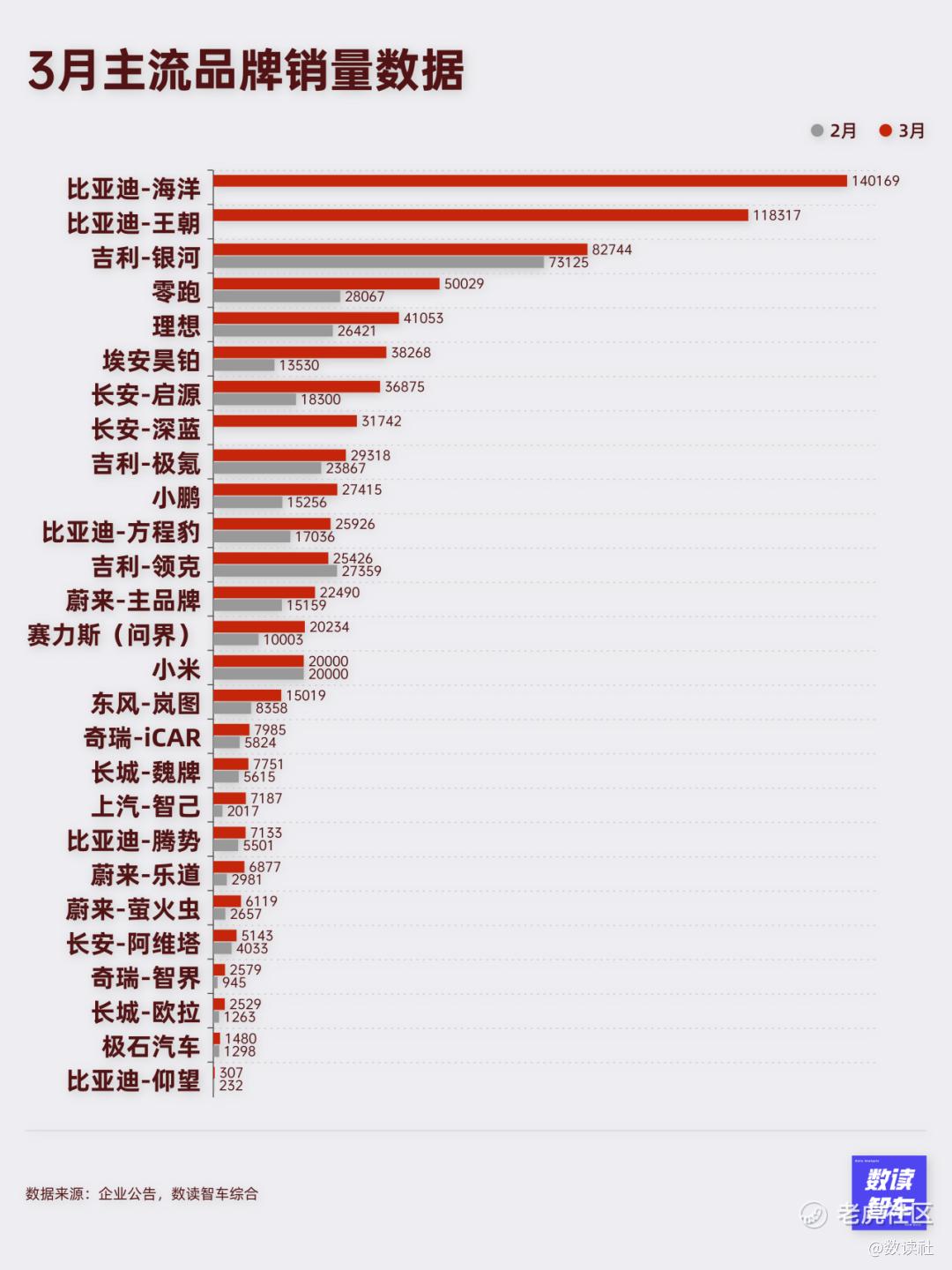 3月,头部车企的增长情况都不算积极。比亚迪下滑19.2%。上汽新能源销量下滑10%,吉利、长安、奇瑞只是个位数增长。