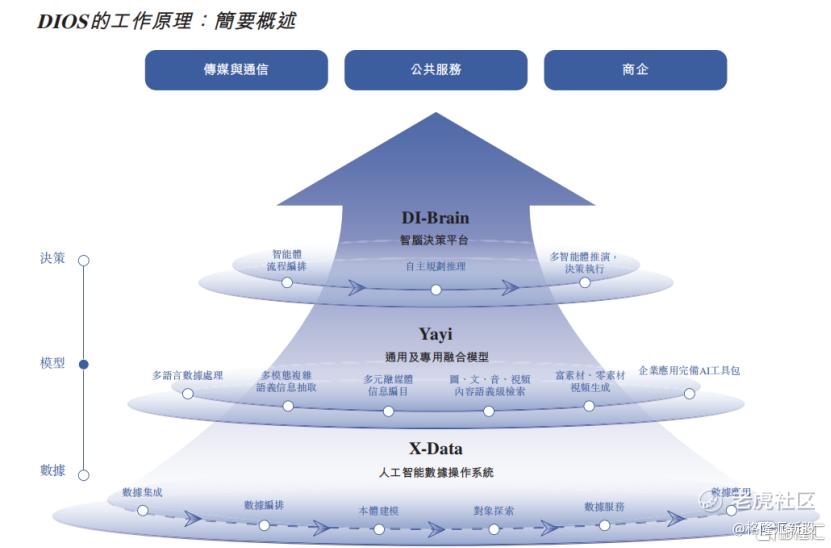 DIOS系统自下而上包含了三层:1、数据层——X-Data,企业级数据集成与分析平台;2、模型层——雅意大模型,旨在大幅提升对企业数据的处理与理解能力;3、决策层——DI-Brain,旨在精简人工智能应用开发流程的AI智能体开发平台。
