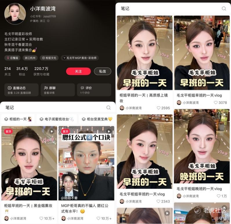 财报发布之前不久,一个叫「小洋南波湾」的毛戈平柜姐在社交网络走红。她最开始发布的视频只是自己工作的日常,之后变成演示怎么用毛戈平的产品打造不同妆容,随后又给好几个网红博主「换脸」化妆,这让她在抖音和小红书上合计拥有了超60万粉丝,多个视频点赞量上万。有消费者表示,她们是因为被小洋的化妆技巧吸引,开始关注毛戈平。