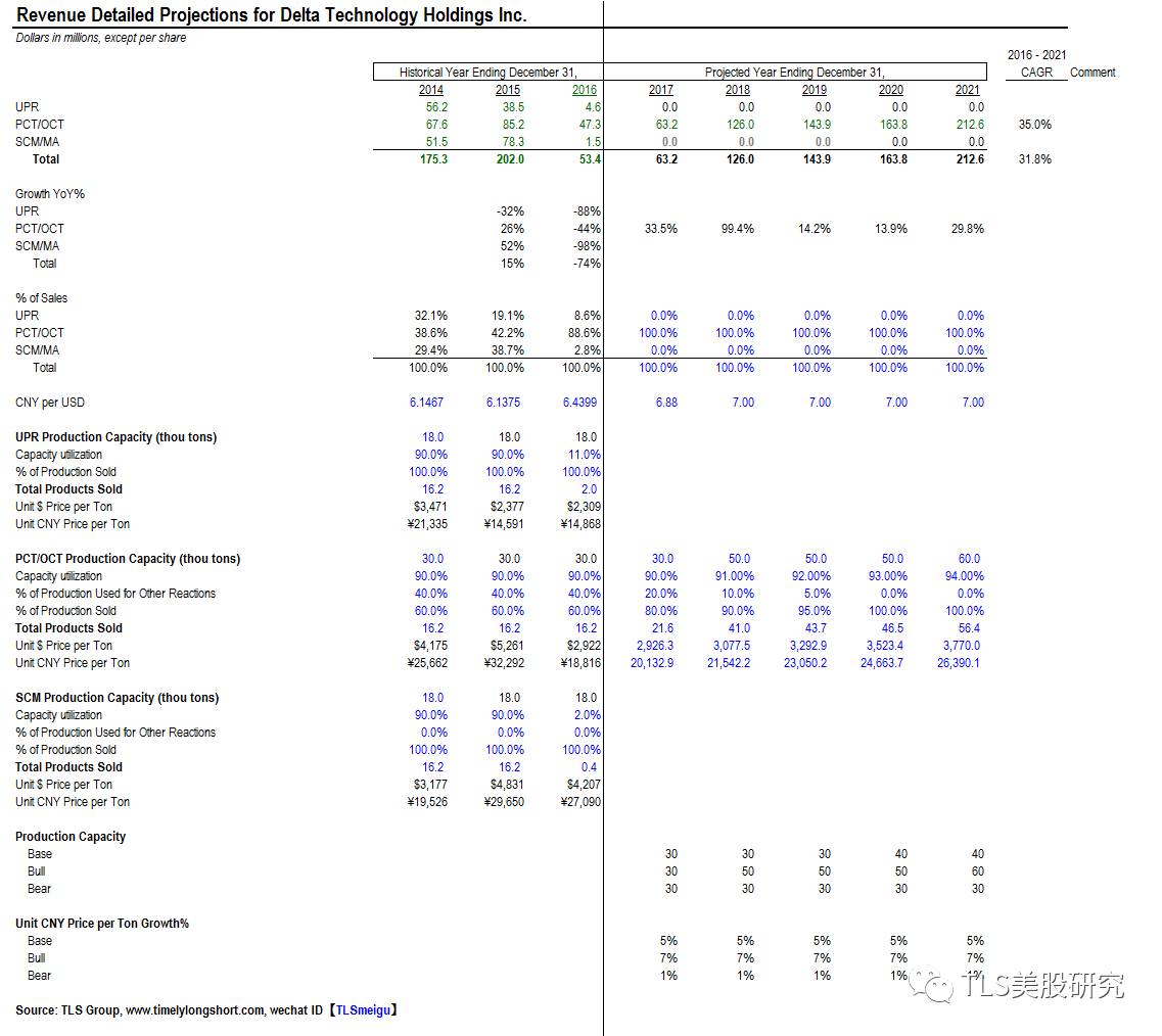以下是我们对销售的预期的估算细节。首先是PCT/OCT的产能,我们在基本情况中假设2017到2019年产能均保持在3万吨的水平,2020和2021年产能提高到4万吨的水平(资本支出在之后会提高)。在最好情况下,产能增长到6万吨。最差情况下,产能保持在3万吨的水平。目前PCT/OCT的销售价格经计算约是19,000元人民币每吨,因为包含了各类衍生化学品,和市场的询价不尽相同。我们假设每吨价格分别每年增长5%,7%,或3%,根据不同情况。另外,销售量一般是产能的90%,因为我们对精细化工行业复苏较为看好,我们认为DELT能逐渐将这一比值提高到95%。当然,这也是非常保守的估计,在需求井喷时期,会出现即产即销的情况,迅速达到100%。