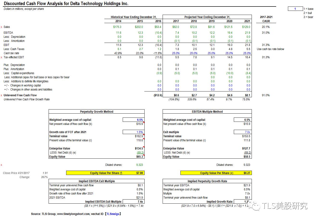 我们认为市价深度低估了公司自16年4季度以来所显示出的良好势头和精专策略,尤其是精细化工行业目前处在的周期反弹期。我们采取了DCF现金流折现的估值方式,先估计出未来5年DELT的现金流,并且在2021年估计一个保守的价值乘数,根据三种情况算出估值。我们的估值模型,在采取了比较保守的估算的基础上,显示DELT的估值有达到$7-17的可能,同时最坏估值在$2左右,在目前的市价的基础上,如果以$1.5做为止损价,盈亏比达到十比一以上。我们以下会详细分布讲解我们的估值过程。
