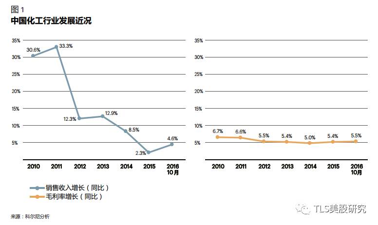 由下图所示,中国化工行业销售增速自2011年以来迅速下跌,增速在2015年见底,2016年末增速已经初步回升到5%左右。同时,行业总毛利的同比增长仅仅保持在跑赢通胀的水平,说明过去5年以来化工行业的供需是饱和的,尤其基础化工产品,比如甲醇等的产能严重过剩。然而,我们认为行业最难的时刻有可能已经过去。