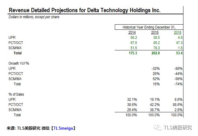 如前所述,DELT除了生产PCT/OCT之外,还会生产UPR和MA,但去年UPR和MA的销售额大幅下滑。我们判断不属于常规形式的售价波动,而是公司在转型专注于PCT/OCT这一个产品线。如下图最近的2016年4季度披露里面也可以看到,公司全部销售来自于PCT/OCT系列。
