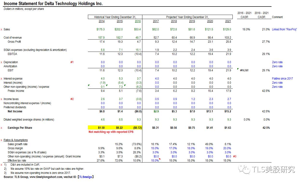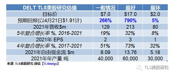 DELT公司近期已经在精简产品线,聚焦其产能份额最高的产品,并加大下游营销,有很大可能实现利润率大幅增长的新常态,并随着业绩反转带来大幅估值提升。我们认为该股票的目标价在$7-17左右,与目前的$1.91的市价(4/21/2017)相比,目标回报有可能相当惊人,而止损额度仅为20%,盈亏比在十比一 以上左右,非常值得控制好仓位介入。