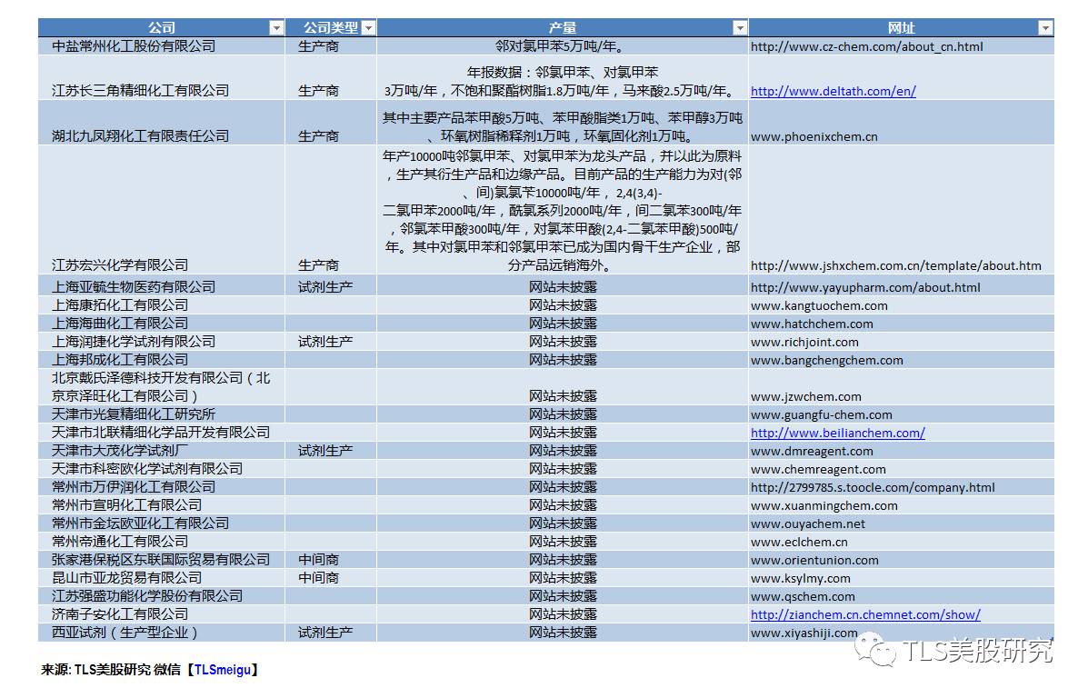 公司所服务的终端客户遍布全球,达350多家。公司的主要产品有包括对氯甲苯(“PCT”),邻氯甲苯(“OCT”),多种PCT / OCT下游产品(根据公司披露,其对氯苯甲醛和邻氯苯甲醛产品的产量已经是亚洲最大),不饱和聚酯树脂(“UPR”),马来酸(“MA”)和其他副产品化学品。各类产品的制造业应用广泛,比如医药、化工产品、清洁能源、染料和颜料、汽车、航天、陶瓷、涂料印花等。