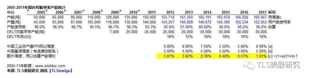 在网上研究资料中,以下2005-2011年的PCT/OCT产量和生产方的统计还是最为详尽的。值得注意的是,2011年是08年后中国经济的小阳春,中国经济随后走弱,中国化工行业销售增速也迅速下降,很难想象产能在2011年之后会有爆发性的增长。我们根据中国工业生产总值增速跑赢5%(实际通胀)的额外增速来估算了一下,目前全国OCT/PCT的产能应该仍然在17万吨左右,而DELT本身就占了近18%的产能。当然,这是非常简单的估算。