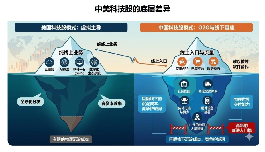 美国互联网巨头以线上业务为主,典型轻资产模式。而中国互联网公司多为O2O(线上到线下)模式,既有线上平台,也深度布局线下交付能力,积累了可观的实体资产壁垒。