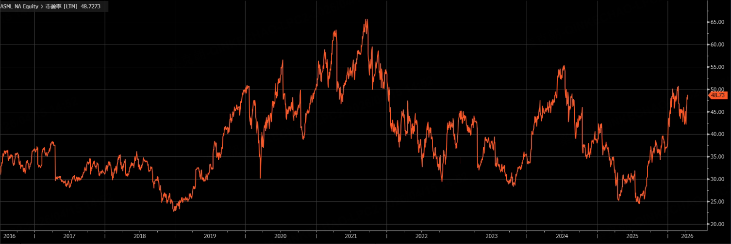 如果阿斯麦年度指引完成,其市盈率有望降至43倍,估值略高,但尚未超过警戒值。