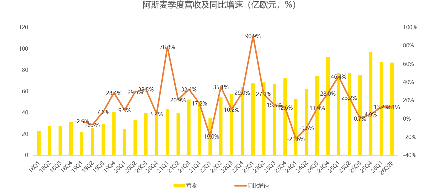 从一季度收入上看,阿斯麦当季为87.7亿欧元,同比增长13.2%,位于管理层给出的82-89亿欧元指引高端: