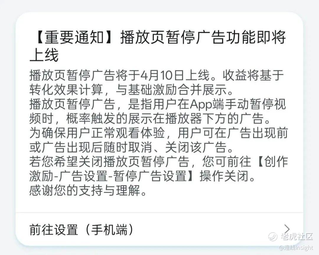 用户在手机上观看视频时点击暂停,有一定概率会在播放器下方弹出一条广告,不遮挡画面、可一键关闭。单从产品形态来看,这比长视频平台动辄120秒的贴片广告温和得多。