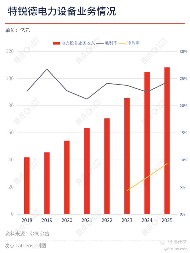 正因此,特锐德的电力设备业务(主要为预制舱变电站业务)从 2018 年的 42 亿元稳步增长至 2025 年的 108 亿元。