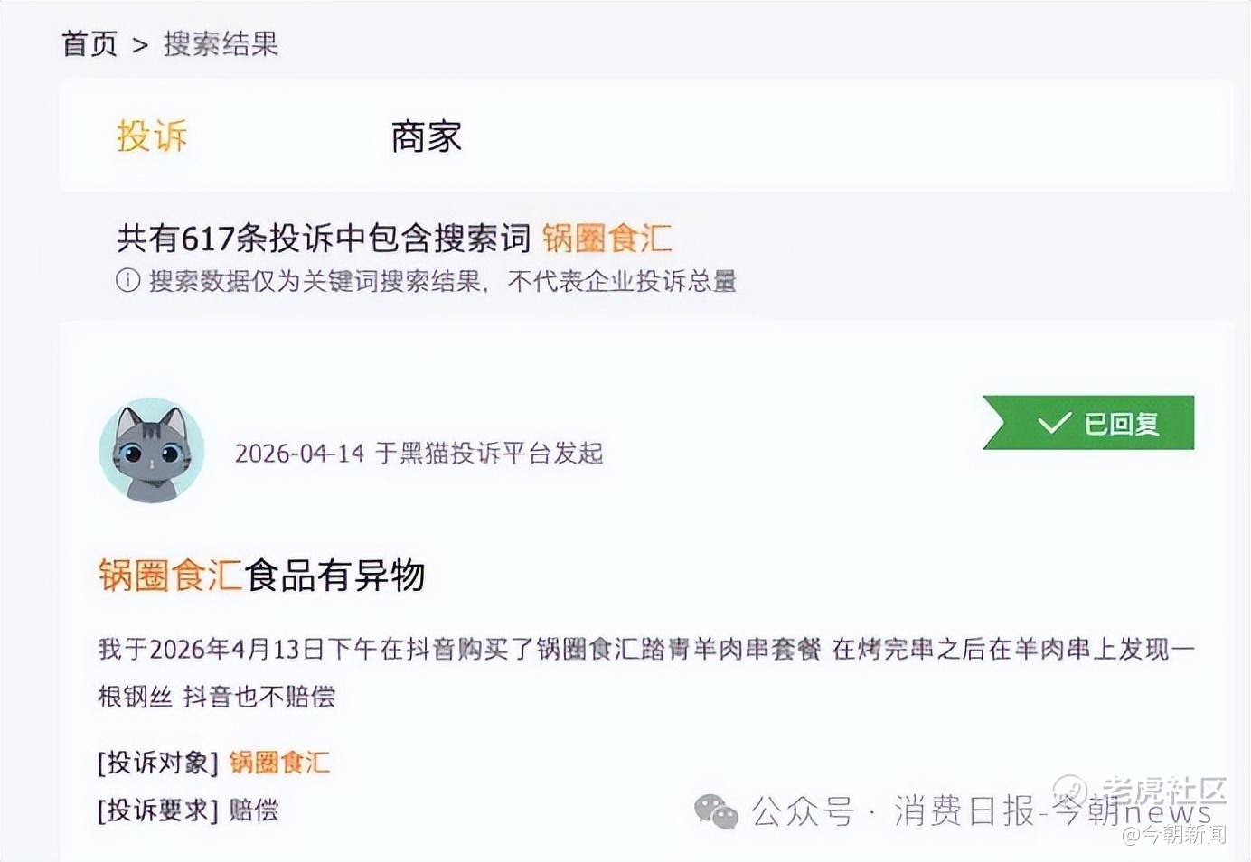 在黑猫投诉平台上搜索“锅圈食汇”,截至4月15日,相关投诉已有617条,不少都和食品安全相关,投诉理由包括购买的羊肉串套餐烤完后有一根钢丝,肉卷里吃出异物疑似指甲,冻品脑花霉变、食材变质、食材过期等。