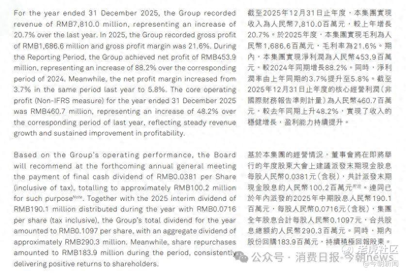 先看核心财务数据,2025年锅圈实现总营收78.10亿元,同比增长20.7%;毛利16.87亿元,毛利率21.6%;净利润4.54亿元,同比大涨88.2%,净利率从2024年的3.7%提升至5.8%。而反映主营业务盈利能力的核心经营利润(非国际财务报告准则计量)为4.61亿元,同比增长48.2%,增速显著高于营收。