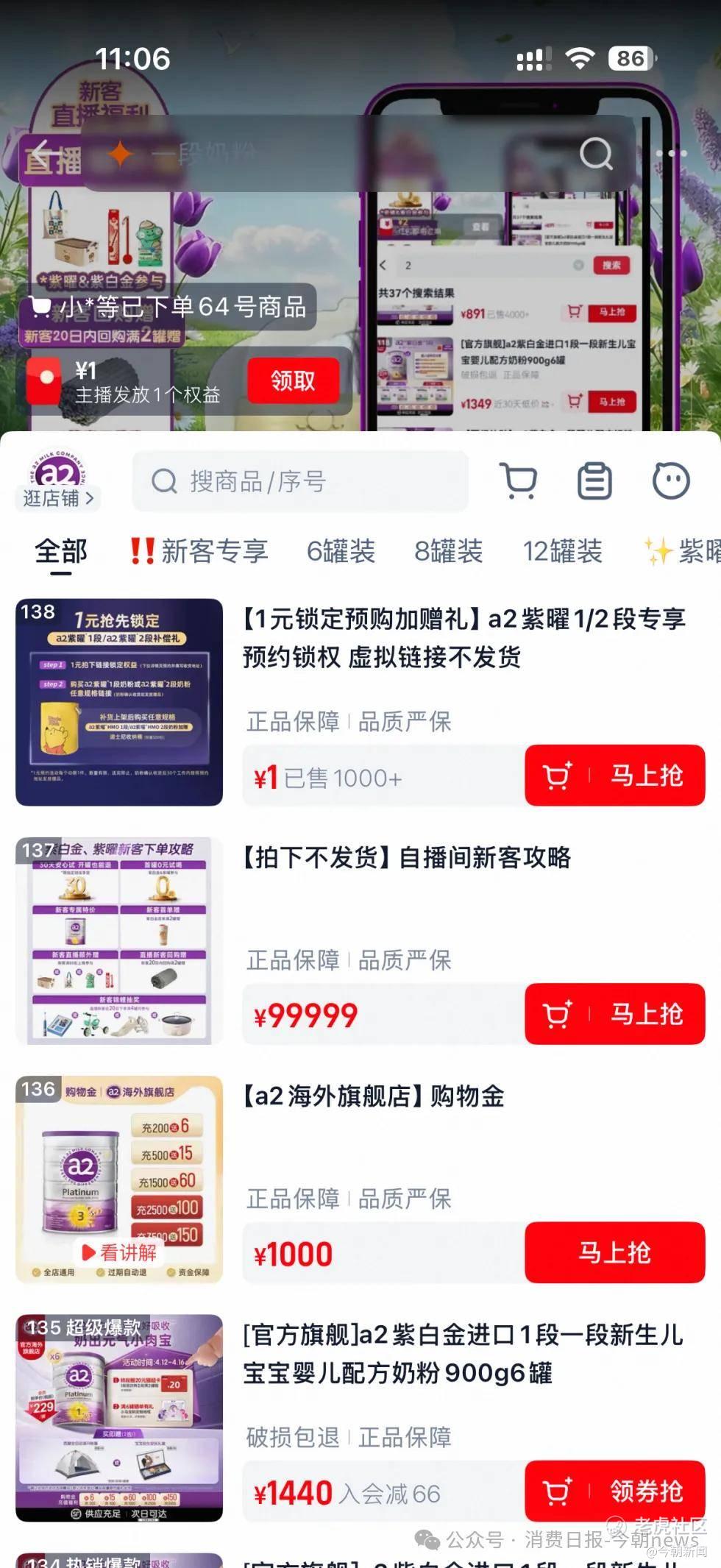 而在a2海外旗舰店中,英文标签a2 Platinum紫白金款目前1段、2段、3段均显示有货,并标注有“供应充足 次日可达”字样,只是其2025年初刚推出的高端新品a2紫曜™目前1段、2段同样处于缺货状态,同时,品牌直播间中不断有消费者询问这两款产品何时到货。