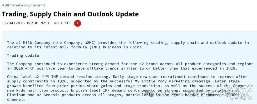 消费日报-今朝新闻讯(记者王紫茜)4月13日,新西兰a2牛奶公司(The a2 Milk Company Limited,下称“a2公司”)发布自愿性公告,其中文标签婴配粉预计2026年4-5月出现阶段性供应紧张,并同步下调2026财年业绩预期。