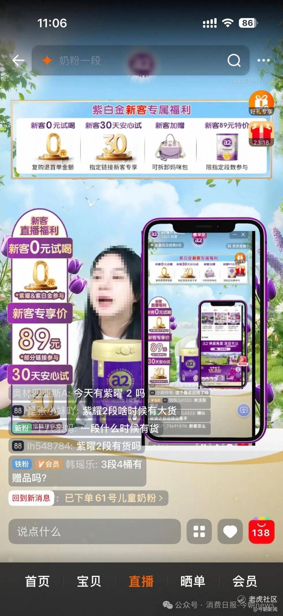 为此,该店直播间还特意推出“1元抢先锁定a2紫曜™1段、a2紫曜™2段补偿礼”活动,即购买此链接用户可在该店a2紫曜™HMO1段、a2紫曜™HMO2段奶粉补货上架后购买任意规格可获得该补偿礼品。