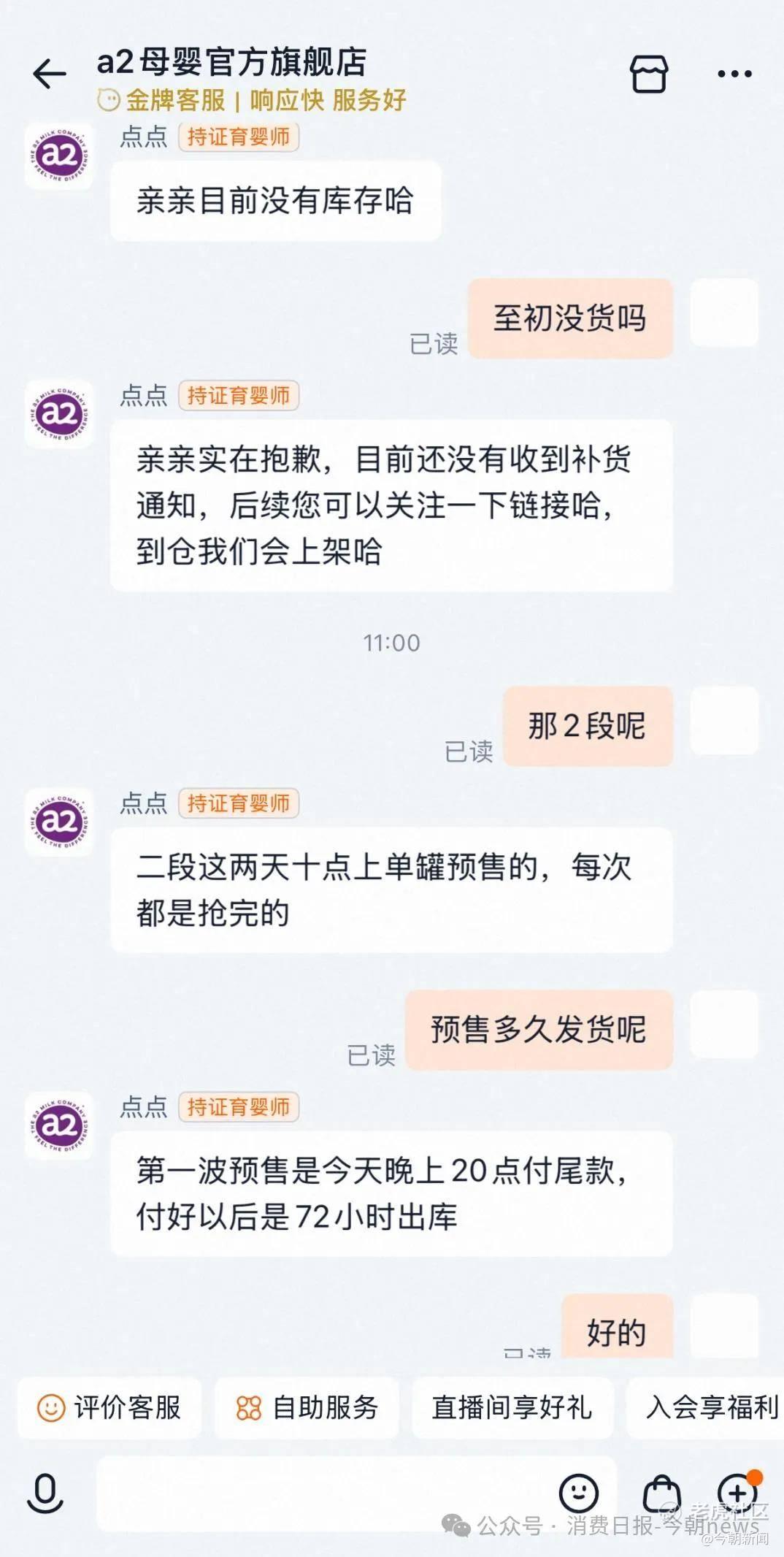 记者在淘宝a2母婴官方旗舰店看到,目前a2至初1段、2段,以及4段儿童调制乳粉处于缺货状态,记者以消费者身份询问旗舰店客服产品情况,其客服确认,1段目前没有库存,2段则实行限量预售,这两天十点会上单罐预售,付款后72小时出库。京东a2至初母婴旗舰店同样显示1段、2段,以及4段儿童调制乳粉处于缺货状态,只有3段产品在正常销售。