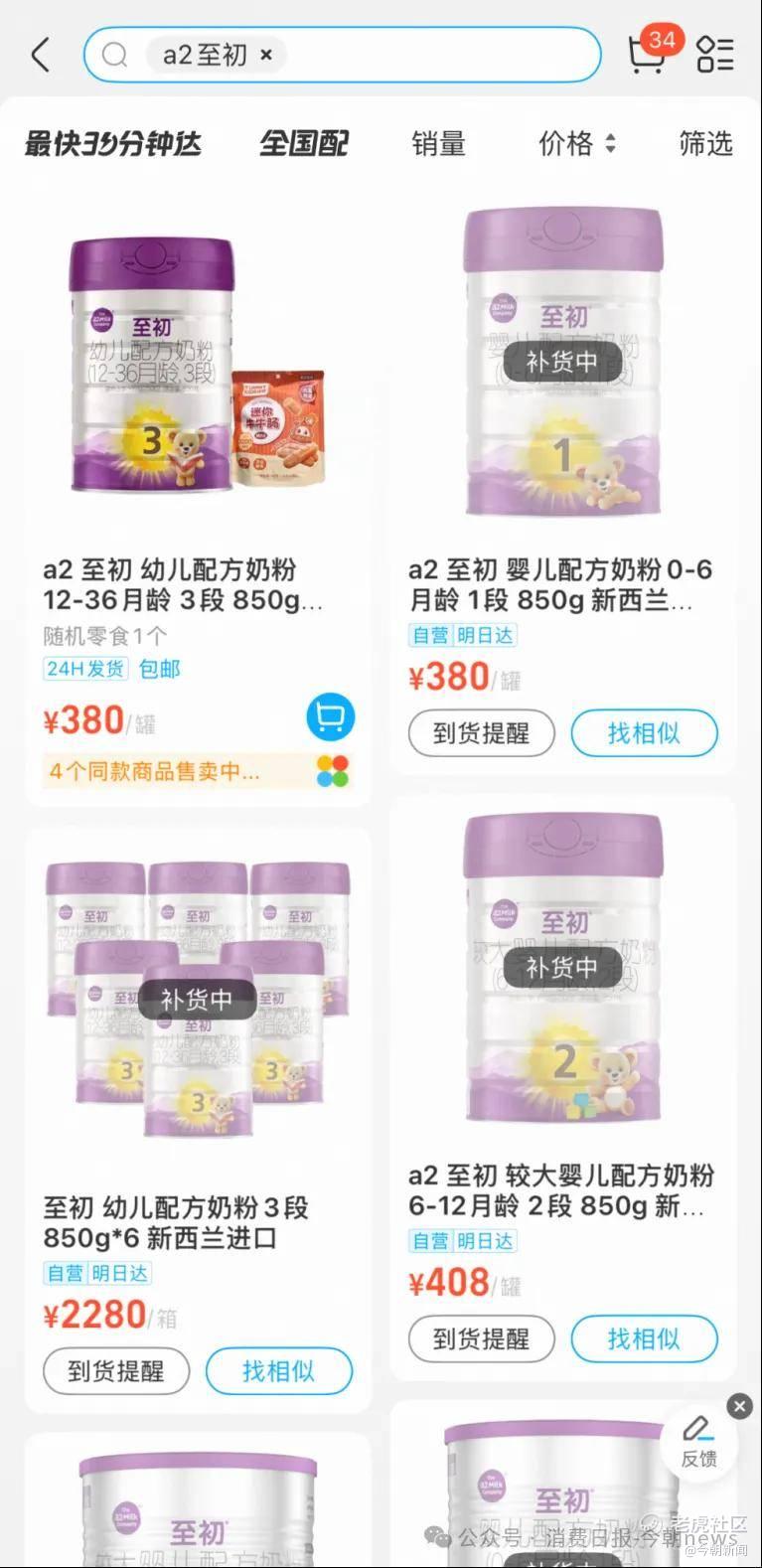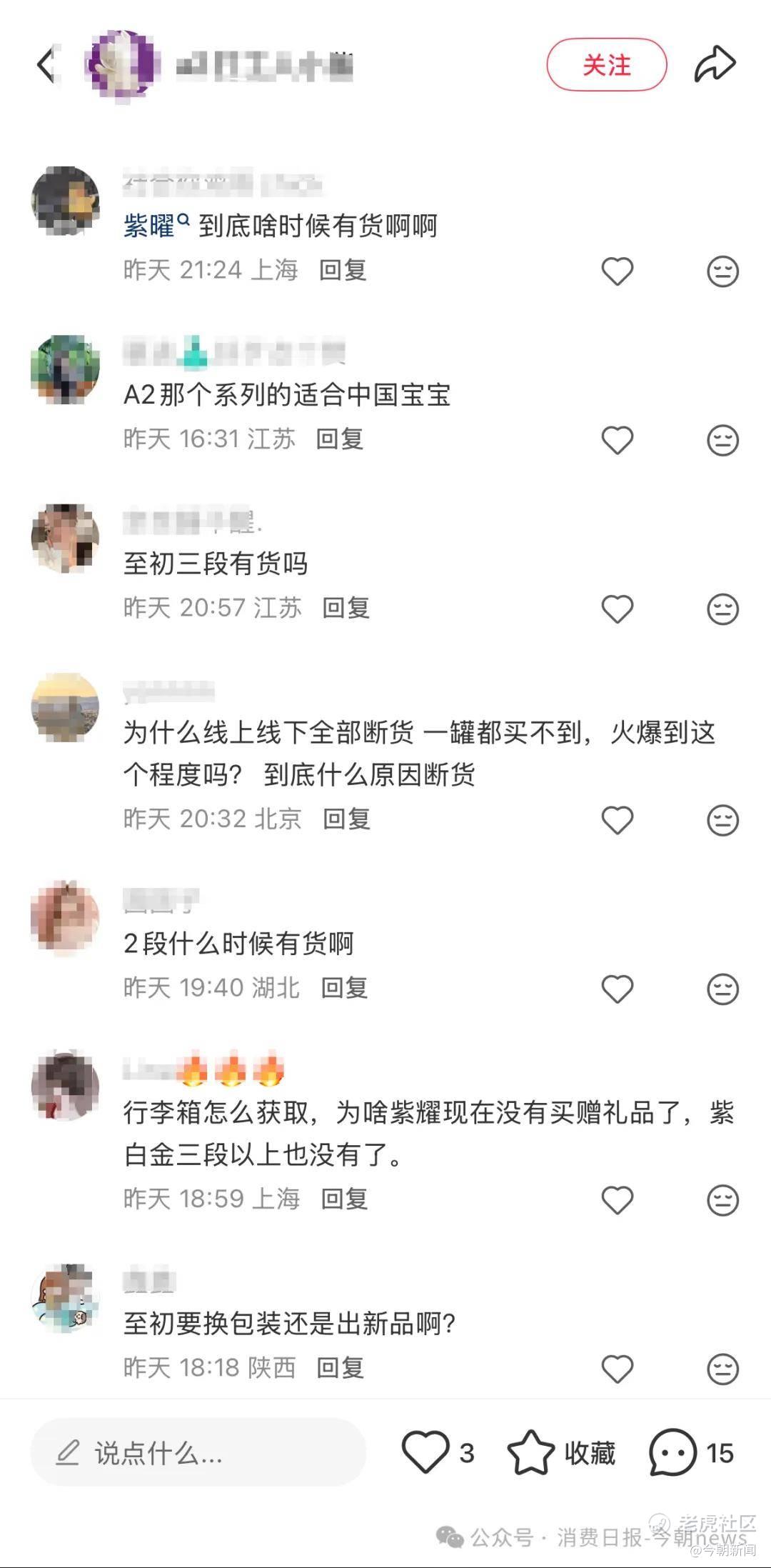 在小红书平台,《今朝新闻》发现,有地址显示为北京、湖北、江苏、上海、浙江、广东等IP地址的网友也在询问a2公司的产品缺货问题,询问产品涉及上述中文标签1段、2段产品以及a2紫曜™1段、2段产品,可见此次断货影响范围之广。