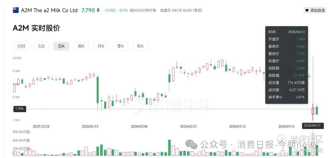 公告发布后,a2公司股价盘中一度暴跌17%,终盘收跌12.99%,报8.04澳元。截至发稿,a2公司股价报7.790澳元/股,跌3.11%。