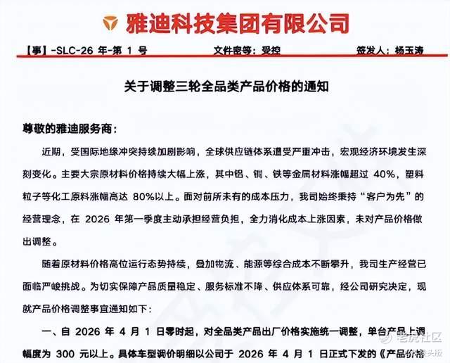 早前,雅迪在相关调价函中明确表示,决定自2026年4月1日零时起,对全品类产品出厂价格统一调整,单台上调幅度300元以上。