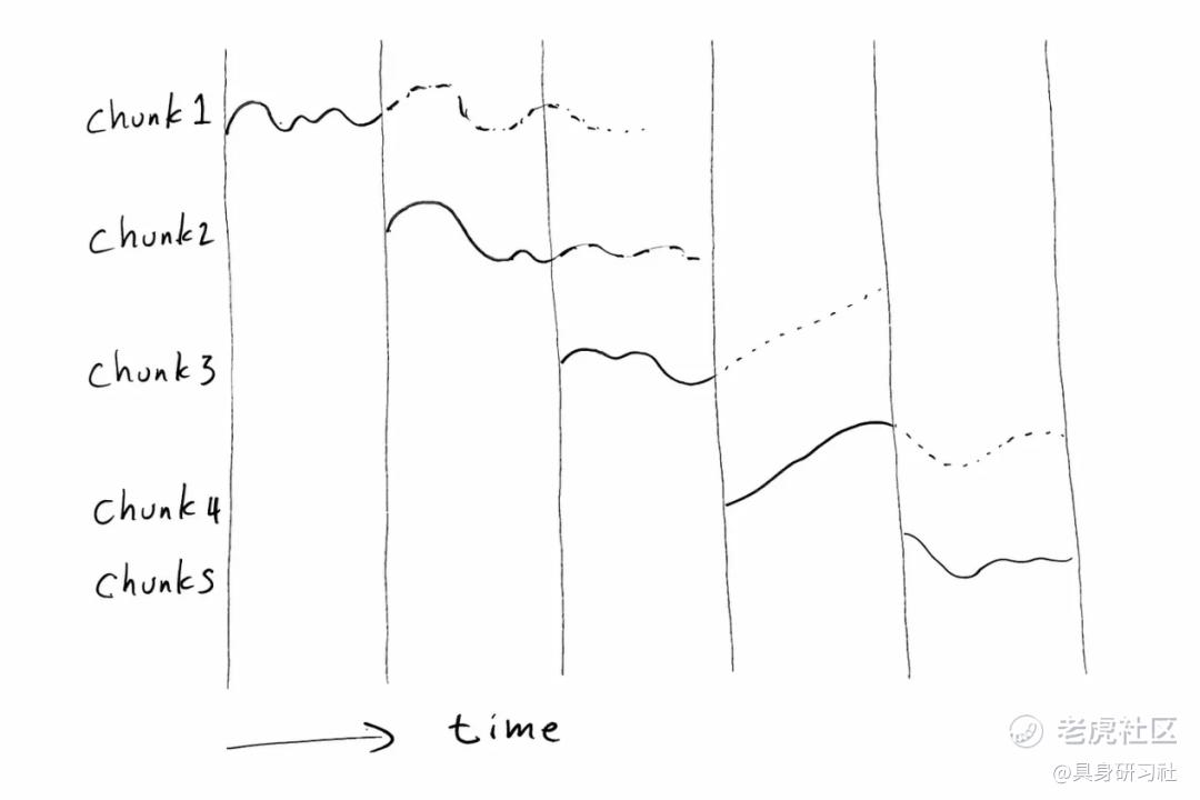 机器人关节沿第 1 段规划轨迹(Chunk 1)运动,当第 2 段新轨迹生成时(对应图中竖线分隔时刻),系统切换至第 2 段轨迹执行,以此类推。向模型发起轨迹规划请求的频率越高(即图中竖线间距越近),机器人对非预期扰动(如袜子堆叠状态偏离预设)的实时响应与应变能力越强。