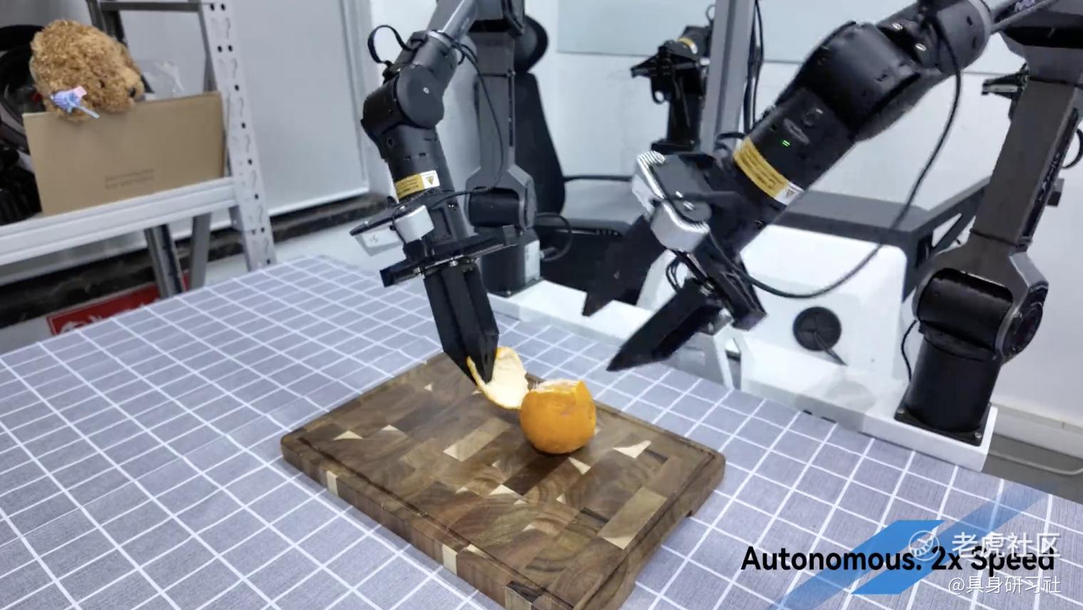 先从最难的剥橘子(金牌任务)来看,比赛要求机器人精准区分果皮与果肉的细微视觉特征,稍有不慎就会捏烂果肉,需要实时跟踪剥制过程中的果皮形变,要求视觉感知有极高的鲁棒性。PI在这个项目中借助削皮刀耗时2分46秒完成,而星动纪元动作干净利落,不仅在速度上提升了35%,用时1分47秒完成,更是成为赛事首个实现完全无工具纯手剥操作的团队。