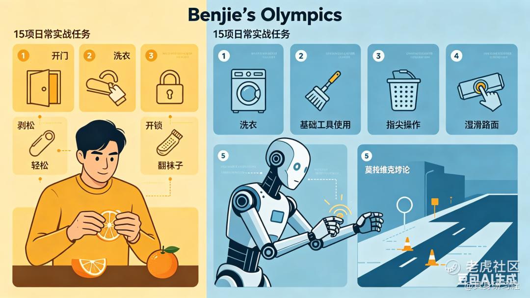 从具体赛事来看,Benjie’s Olympics 的核心设计,完全锚定了横亘在具身智能领域最核心的 “莫拉维克悖论”。即人类凭借本能就能轻松完成的日常感知与动作,对机器人而言却是极高难度的技术壁垒,而人类觉得复杂的高阶推理,机器反而更容易实现。