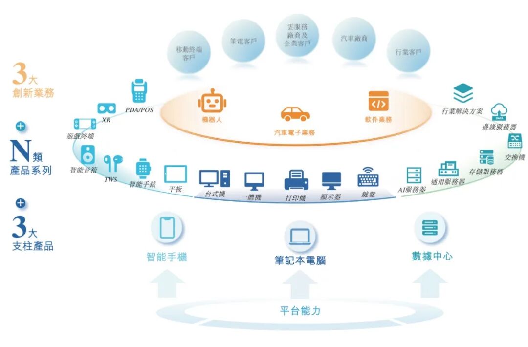 此外,按2024年全球笔记本计算机ODM出货量计,公司为全球第四大及中国最大的笔记本计算机ODM厂商,市场份额为9.6%。按2024年中国数据基础设施业务收入计,公司在中国所有数据基础设施厂商中排名第六,市场份额为5.0%。公司深刻洞察和理解全球品牌客户多样化、多场景的产品需求,战略性布局了“3+N+3”智能产品矩阵:构建了智能手机、笔记本计算机、服务器3大支柱型产品。基于此,公司已拓展出移动终端及AIoT、计算业务及数据中心业务三大产品系列。同时,公司持续探索汽车电子、软件业务和机器人3大创新业务领域的新机遇。