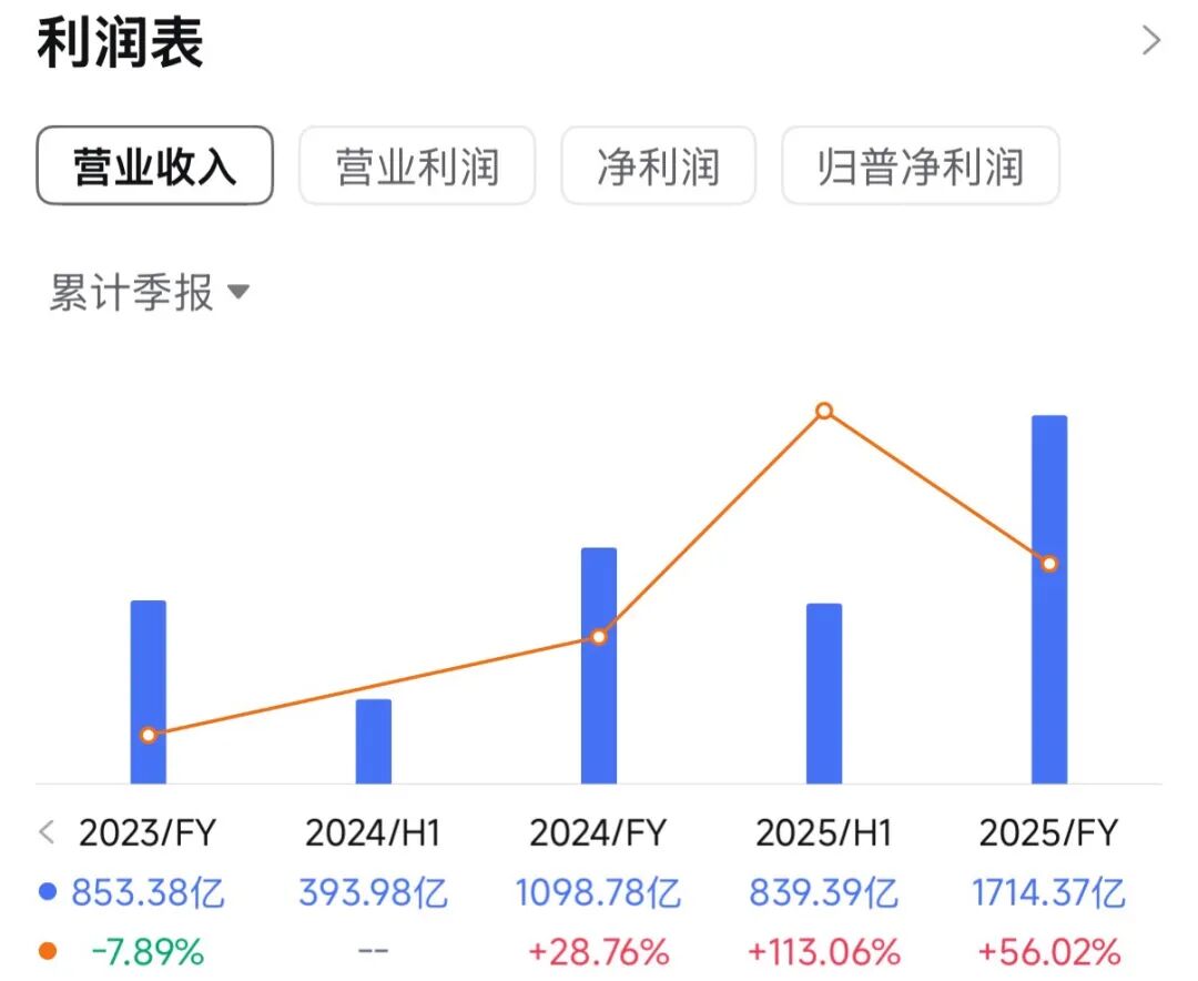 收入分别约为人民币853.38亿、1098.78亿、1714.37亿,2025年同比+56.02%;