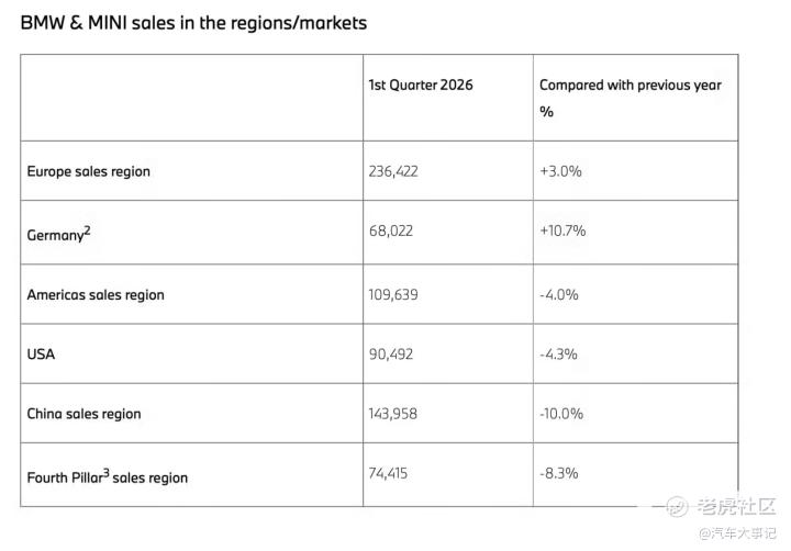 2026年4月,宝马集团如期交出第一季度成绩单。全球交付56.57万辆,同比下降3.5%;在华销量14.4万辆,同比降幅达10%。
