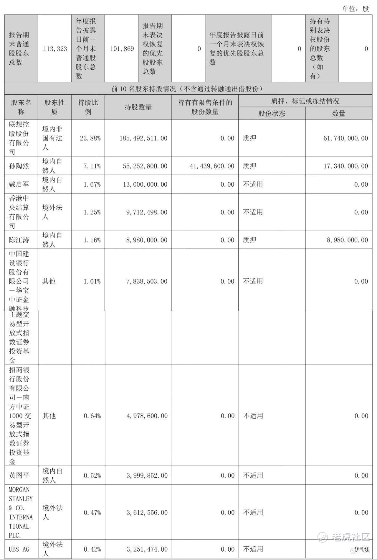截至2025年12月31日,联想控股持股23.88%,孙陶然持股7.11%,戴启军持股1.67%,香港中央结算有限公司持股1.25%,陈江涛持股为1.16%,
