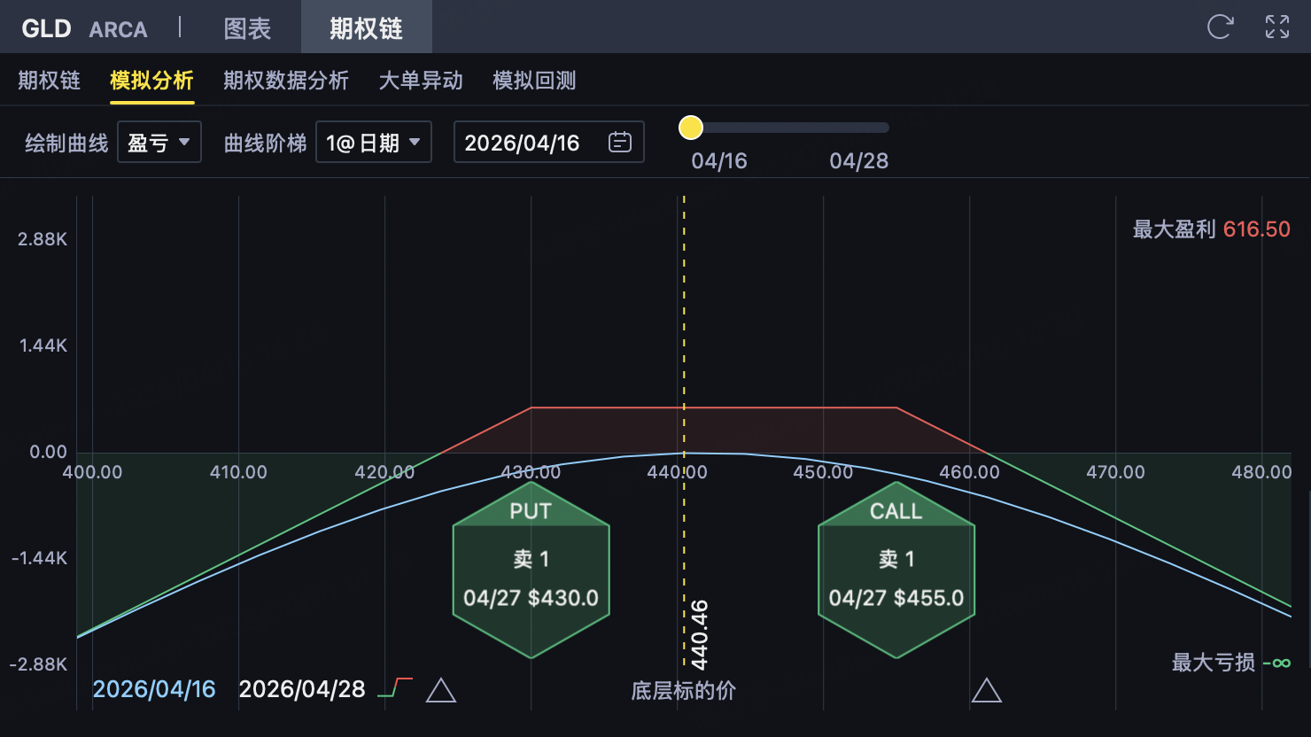 策略的胜率依赖于“价格维持在430到455之间,至少不要有效跌破423.83或突破461.17”的判断;若后续地缘局势突然恶化、美元和收益率快速回落,或反过来市场风险偏好明显回升、黄金避险需求快速降温,GLD突破区间,这组宽跨式的亏损会迅速放大,因此这一策略更适合风险承受能力较强、且能够严格风控的投资者。