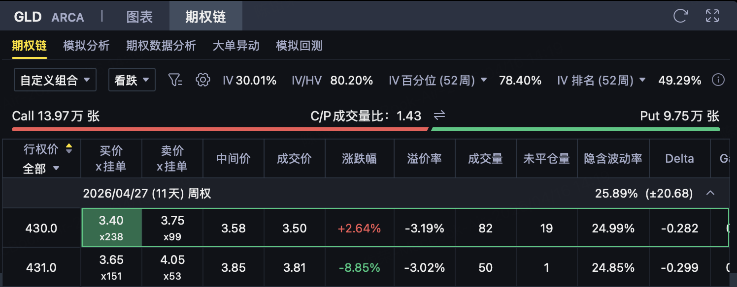 这条Put腿用于博取GLD在到期前能够守住430美元附近支撑。只要到期价格≥430美元,这份Put失效,投资者可保留对应权利金。
