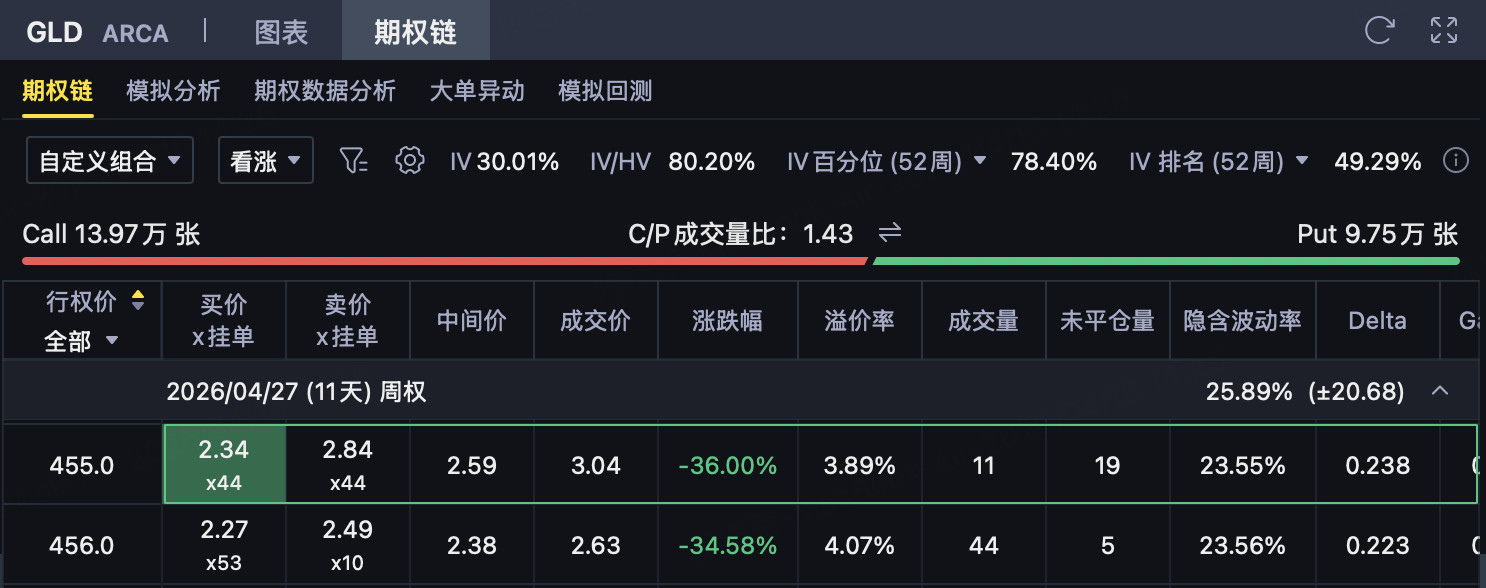 这条Call腿用于博取GLD在到期前难以有效站上455美元。只要到期价格≤455美元,这份Call失效,投资者可保留对应权利金。